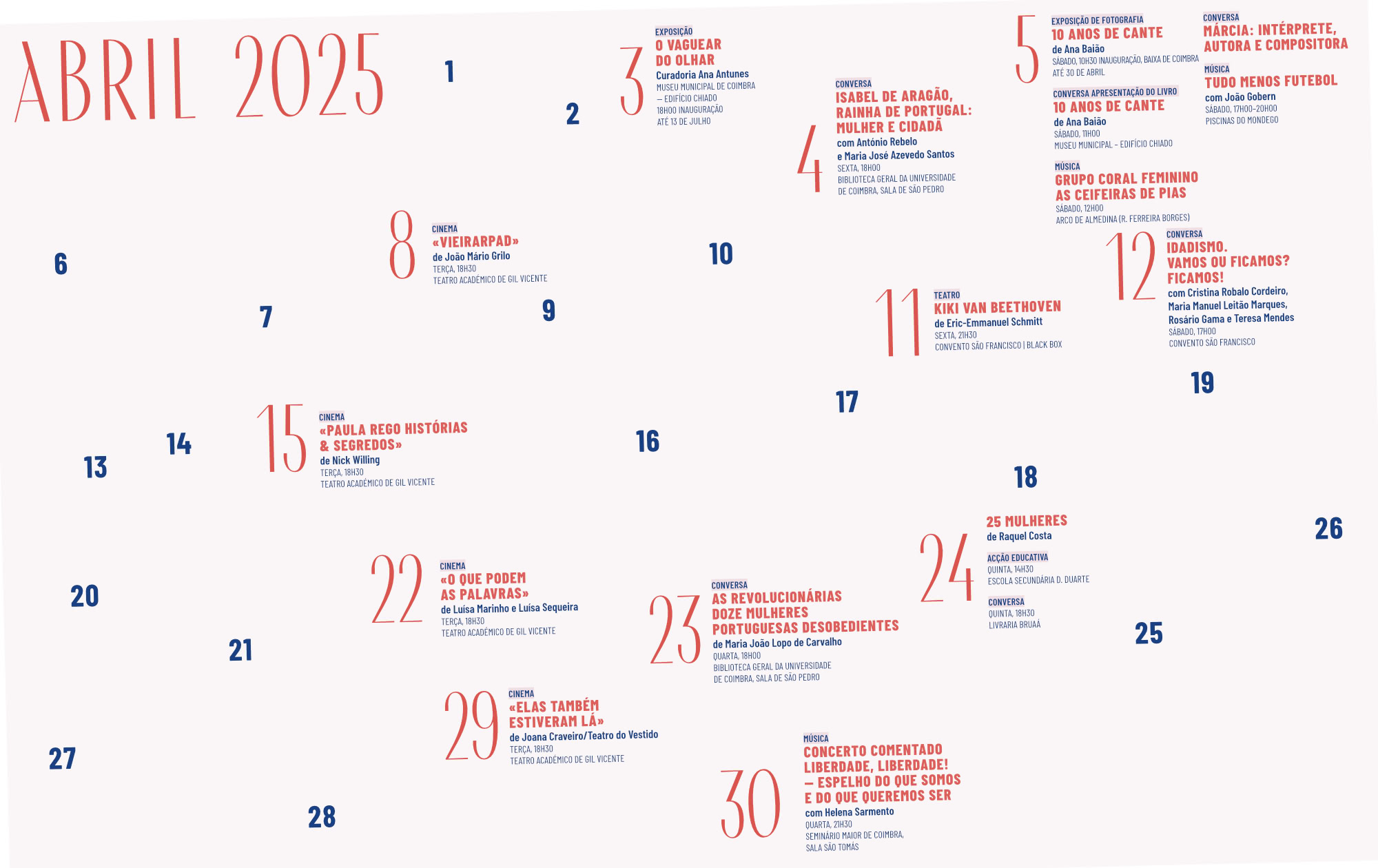2025 é o ano da 4.ª edição de ABRIL NO FEMININO, projecto nascido e criado em Coimbra, que acontece em distintos equipamentos culturais e espaços relevantes do património histórico da cidade, tais como Museu Municipal – Edifício Chiado, Seminário Maior de Coimbra, Biblioteca Geral da Universidade de Coimbra, Teatro Académico de Gil Vicente, Convento São Francisco. Também vamos à Escola, lançar sementes, e à Baixa, para celebrar o Cante Alentejano, que completa uma década sobre a sua classificação de Património Imaterial da Humanidade pela UNESCO. De 3 a 30 de Abril damos Voz às Mulheres, com uma programação diversa e inclusiva. Artes Plásticas, Cinema, Música, Fotografia e Teatro, preenchem algumas das actividades propostas, às quais acrescem Conversas, sobre livros e outras temáticas, com convidados muito especiais. Gerações de artistas, com linguagens e estéticas diferenciadas, estão representadas na exposição O Vaguear do Olhar, assinalando a presença da Coleção AA Contemporary Art Collection, em diálogo com as colecções de arte do Município; doze mulheres portuguesas desobedientes são recordadas em livro; o idadismo e as reflexões de uma mulher em idade sénior são pretexto para uma conversa e uma peça de teatro, respectivamente. «Elas também estiveram lá» ou «O que podem as palavras», dois filmes que nos falam da importância da resistência e da luta das mulheres portuguesas por ideais em tempos de silêncio e de obscurantismo; canções no feminino e canções de liberdade. E muito mais. Consulte o programa e faça-nos companhia!